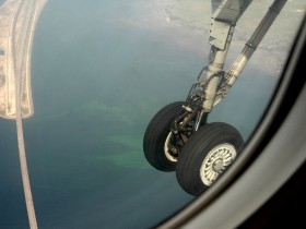 Přistání Dash 8 SAS v Kodani. Vysouvání hlavního podvozku (ještě není v zajištěné pozici) při přeletu nového mostu Kodaň-Malmö