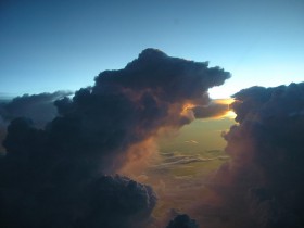 Západ slunce mezi bouřkami během klesání na letiště v Kuala Lumpur