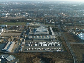 Pohled na autobusové garáže Praha-Klíčov