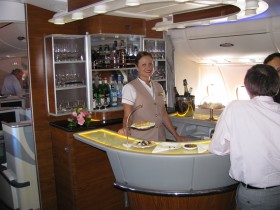 Společný bar pro first a business class v zadní části horní paluby A380