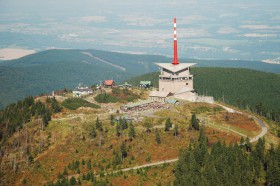 Pod vysílačem ubytovna Kameňák a bufety Plesnivka a Šantán.Zleva meteo stanice,horská služba(červená střecha),Ski chata :-))