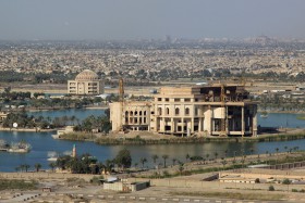 Krátce před přistáním - Američany vybombardovaný a Íráčany znovu obnovovaný komplex paláců Saddáma Husseina.