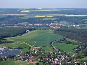 Letiště Plasy. V popředí Rybnice, za letištěm město Plasy.
