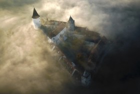 Hrad Křivoklát zalitý ranní mlhou