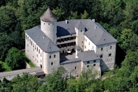 Hrad Rychmburk ležící na severním okraji vesnice Předhradí nedaleko Skutče. Hrad je turisticky přístupný, ovšem je také využíván jako domov důchodců. Foceno z Cessny C-152 OK-MDK při letu LKKL-LKMK.