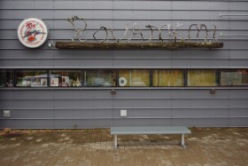 Hlavní nápis na odbavovací hale složený ze sobího paroží