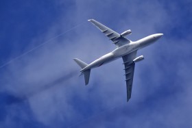 15.09. 16:29 A330 po startu z RWY31 LKPR krájí nízkou oblačnost při obratu směr Dubaj. Foceno přibližně 14 kilometrů na západ od letiště...