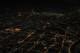 Dubajské letiště (přerušovaná řada bílých světel) po vzletu z dráhy 30R směrem na východ.