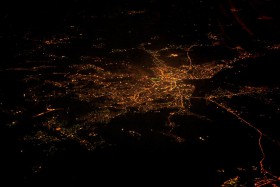 Noční Bělehrad během letu z Řecka do Ostravy, jak byl vidět z FL360