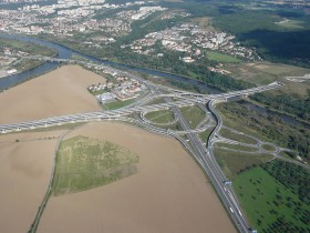 Jedna z největších mimoúrovňových křižovatek v ČR poblíž soutoku Vltavy a Berounky. Scházejí se zde komunikace ze sedmi směrů.