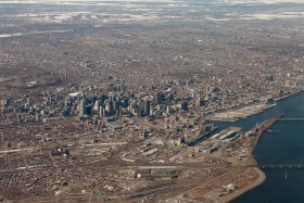 Pohľad na Montreal downtown. Letisko CYUL sa nachádza vľavo, mimo záber.
