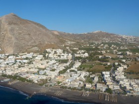 Před přistáním letadla na letišti Santorini defilují podél pláže letoviska Kamari