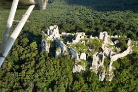 Zrúcanina hradu Gýmeš pri obci Jelenec na úpätí pohoria Tríbeč. Fotografované z lietadla Piper Cub (OM-ABC).