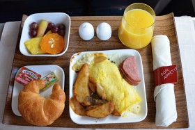 Snídaně v první třídě na letu Anchorage - Minneapolis.