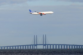 SK996 Peking (PEK) - Kodaň (CPH), v pozadí Öresundský most