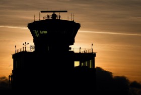 Řídící věž Letiště Václava Havla v Praze při západu slunce.