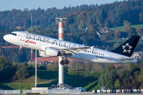 Švýcarský Swiss A320 v zabarvení Star Alliance v záři zapadajícho slunce na startu pro velmi krátký let ze Curychu (ZRH) do Milána (MXP) na lince LX1622.