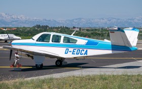 Bonanza s V-tailem odpočívá na letišti v Chorvatském Zadaru, v pozadí pohoří Velebit.