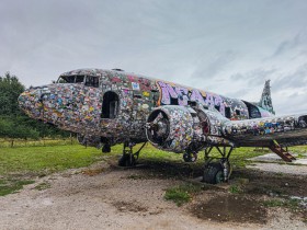 Aktuální stav k letošnímu roku. Od doby, co jsem ho navštívil poprvé, tak přibylo opět několik nálepek cestovatelů. Jedná se de-facto o první zastávku každého cestovatele jak na čtyřstopých, tak na dvoustopých vozidel jedoucích na Balkán. Něco málo k letadlu. Dříve létalo u amerického armádního letectva jako 44-76592 a u Královského letectva jako KN453.