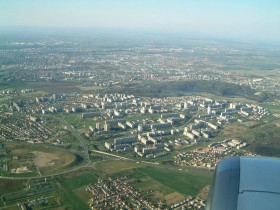 Pohled na sídliště Opatov během přiblížení k dráze 31 letiště Ruzyně