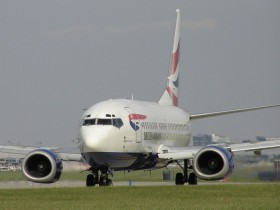 Úmyslně nakloněná fotografie Jumba taxujícího na stojánku u ČSA Cargo