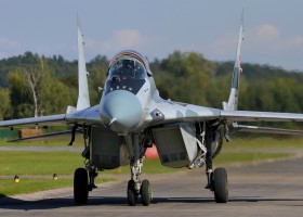 Slovenský Mig29 3911 ještě v původní kamufláži ve které byl převzat po rozdělení republiky, focený dne 3.9.1994 na letové stojánce v Líních. Letoun ještě před modernizací. V galerii zde na Planes ho naleznete pod označením MIG29AS již po modernizaci v šedo-šedé kamufláži. Sken starého negativu.