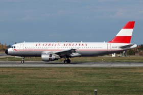 Rakouský Airbus 320 v retro nátěru po přistání na lince mezi Vídní a Curychem s textem na trupu letounu k 60. výročí.